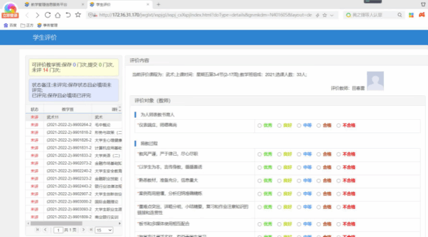 注意:进行教学评价时需要每评价一门课程保存一次,最后全评完了才能提交数据,一次必须全部评完,否则评价数据无效。